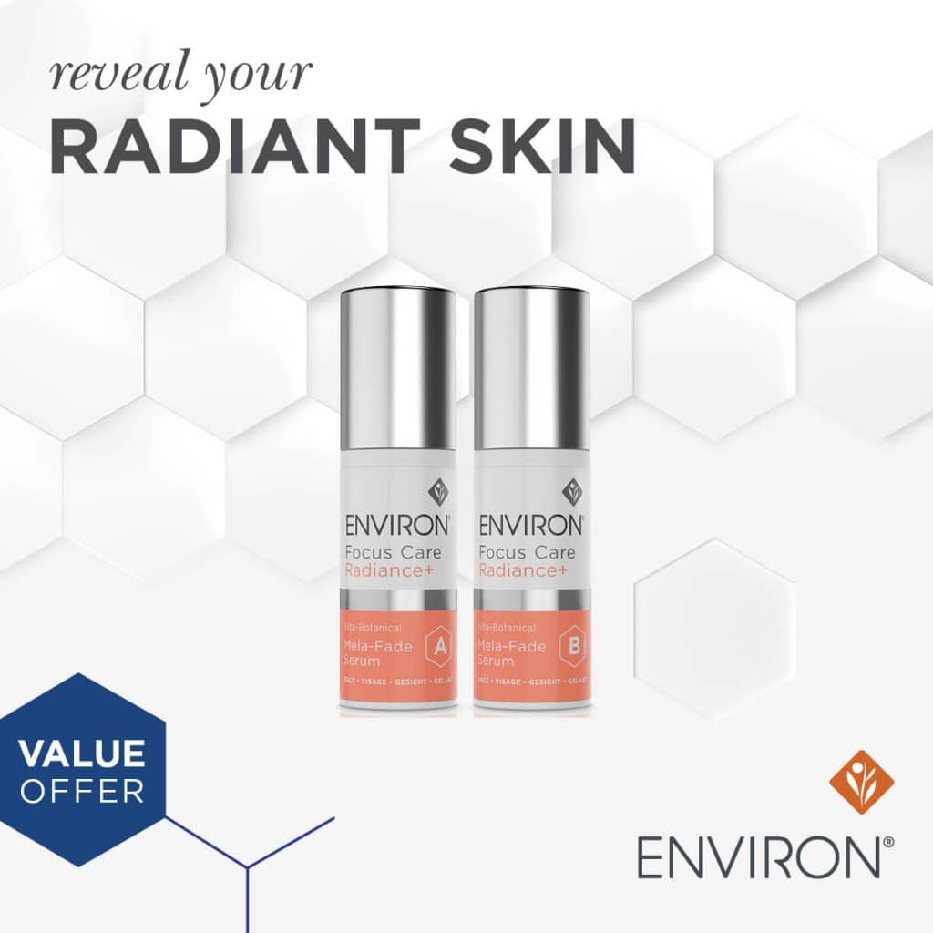 Say goodbye to uneven skin tone and visible sun damage!  Brighten your skincare routine with Environ’s Vita-Botanical Mela-Fade Serum System A+B – breakthrough serums designed to target the appearance of discolorations. Packed with a concentrated mix of vitamins and botanicals, this serum system specifically addresses photo-aging, pigmentation, and age spots.